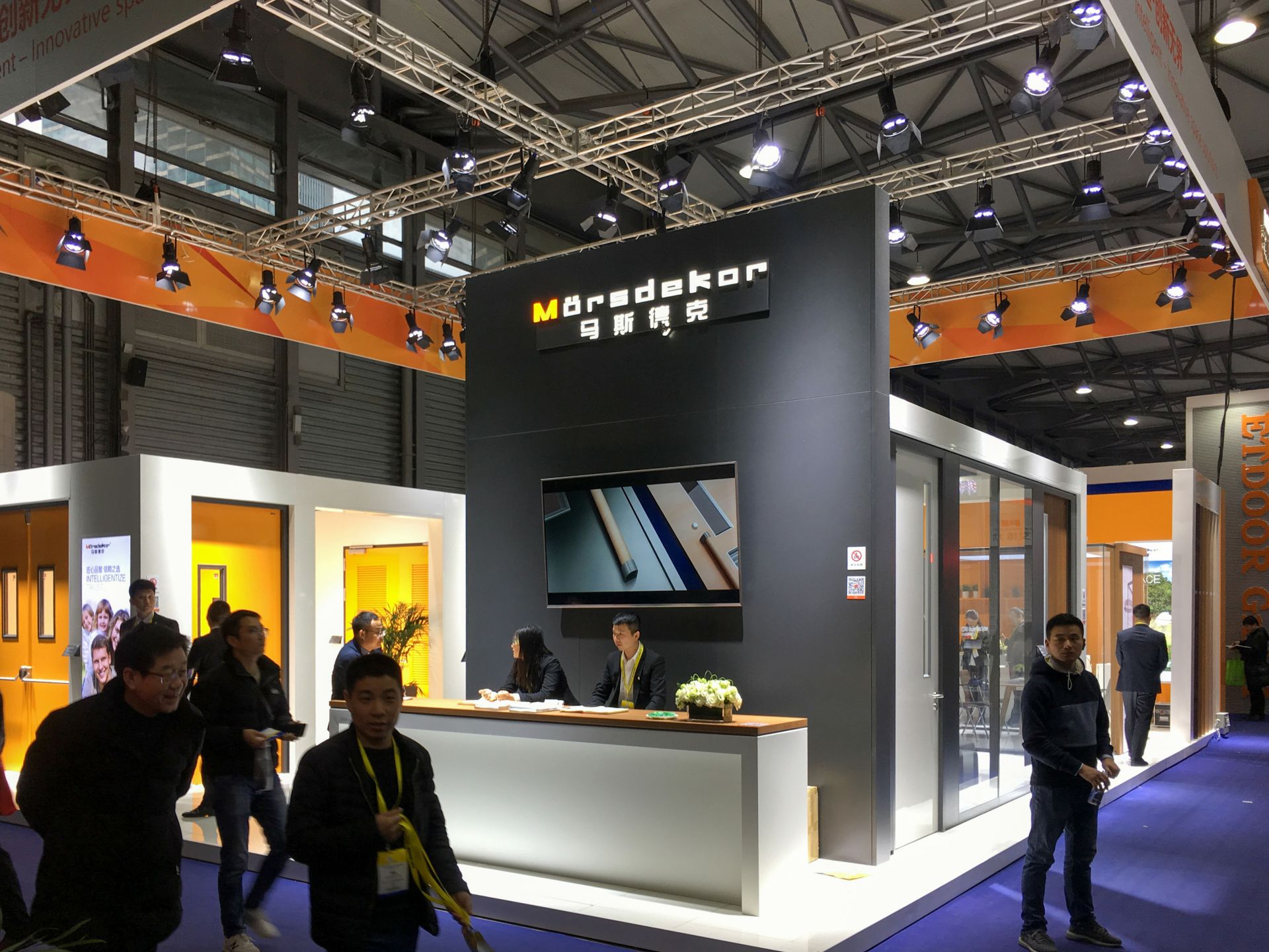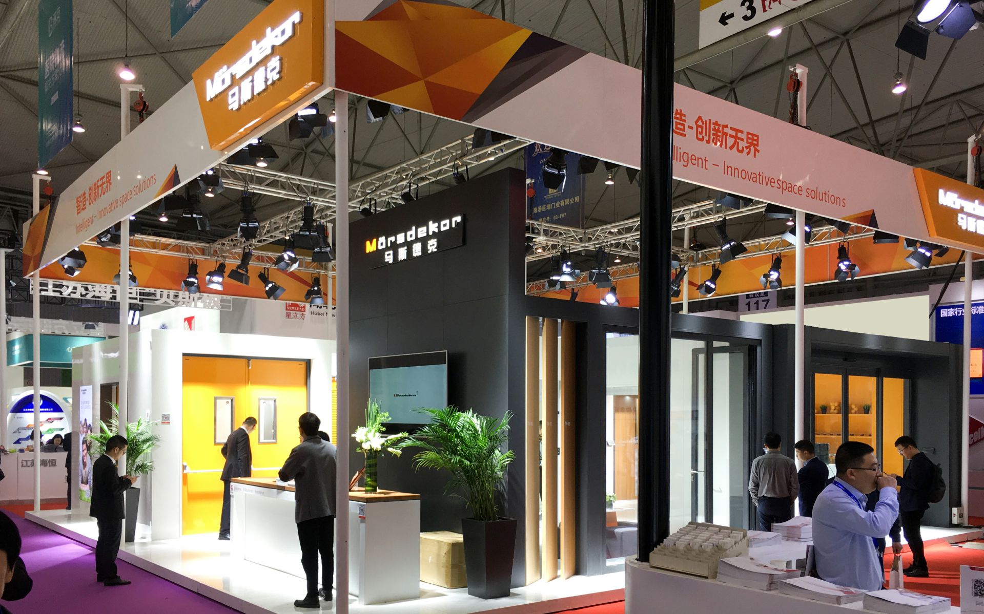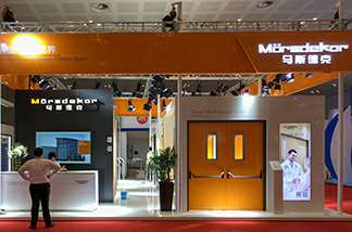 此次主要展示了平开门系统、防火门系统,并呈现了多种应用空间系统解决方案,福州明辉数字设计有限公司标志性橙白相间的展示空间一如既往的吸引着众多参观者的目光。